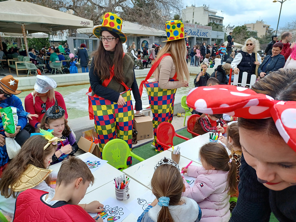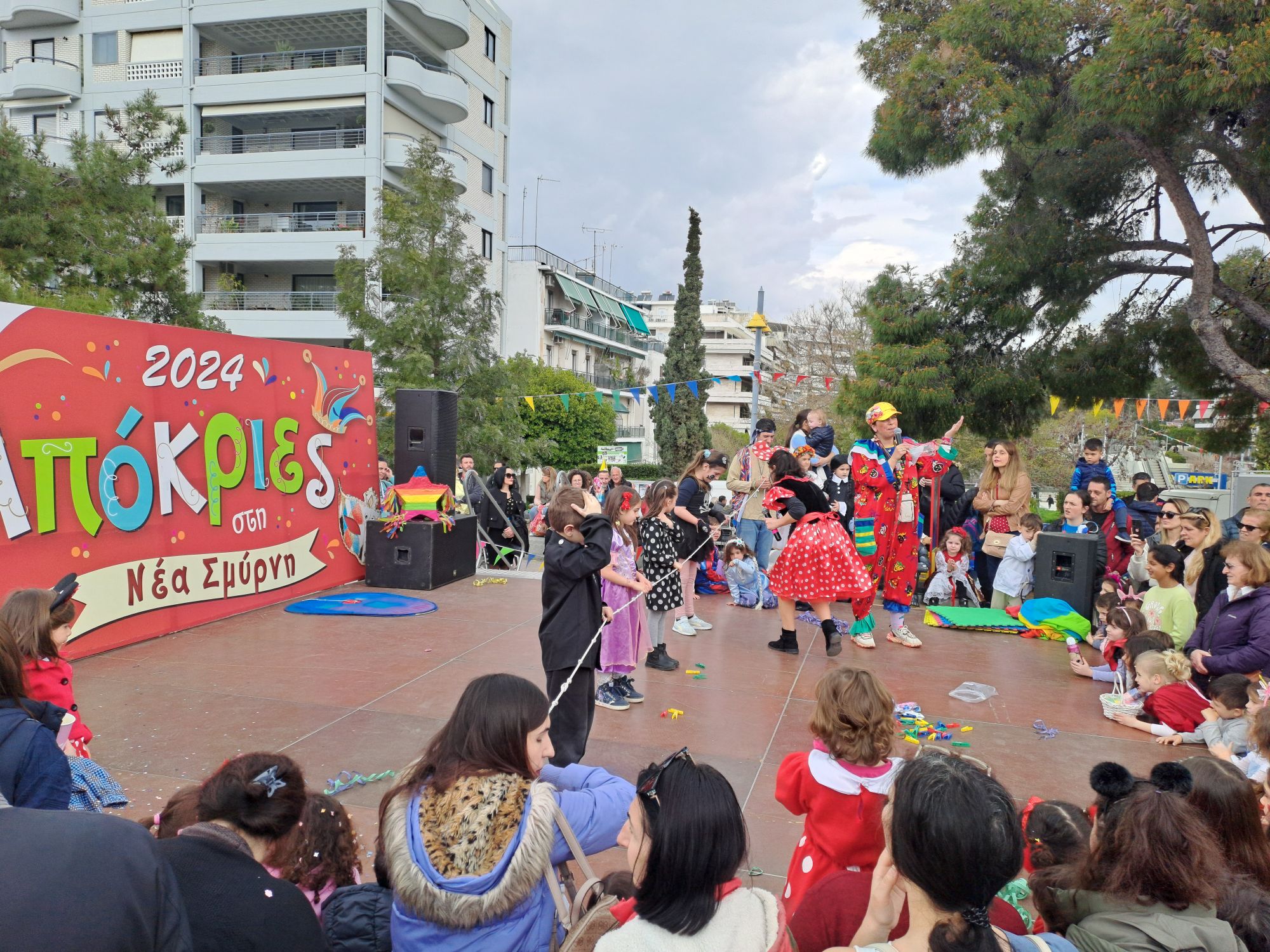 Την Κυριακή 17 Μαρτίου από το πρωί η Πλατεία της Νέας Σμύρνης, ήταν βαμμένη στα πολύχρωμα χρώματα της Αποκριάς. Το Παιδικό Πάρτι που ξεκίνησε από τις 11 το πρωί είχε μάγους, ταχυδακτυλουργούς, ξυλοπόδαρους, face painting, δώρα και κεράσματα. Οι γνωστές φιγούρες του Nickelodeon Μπόμπ Σφουγγαράκης και Ντόρα η Εξερευνήτρια, έκλεψαν την παράσταση αφού εκατοντάδες παιδιά τους ακολούθησαν στις βόλτες που έκαναν και φωτογραφήθηκαν μαζί τους. Την ίδια ώρα το Αποκριάτικο τρενάκι, ξεκινούσε από το ΚΕΠ και έκανε το γύρο του κέντρου της πόλης, γεμάτο από κόσμο.