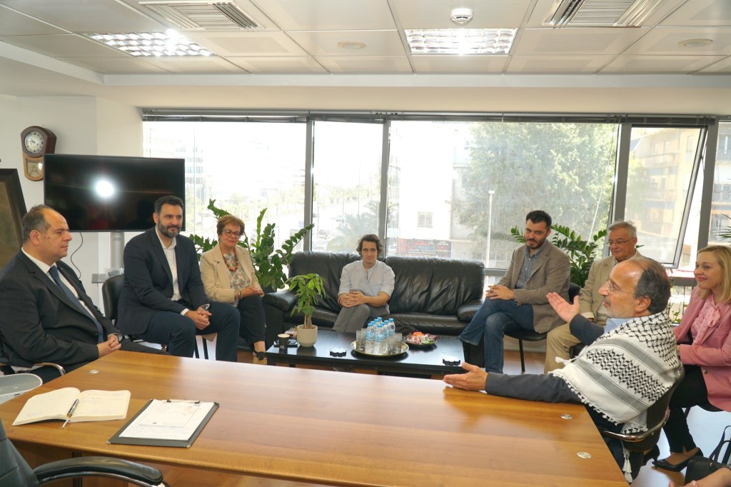 Τον Πρέσβη υποδέχτηκαν στο Δημαρχείο, εκτός του Δημάρχου που φορούσε την παραδοσιακή μαντήλα που του είχε δωρίσει ο Παλαιστίνιος εκπρόσωπος στην τελευταία τους συνάντηση, ο Πρόεδρος του Δημοτικού Συμβουλίου Γιάννης Καρούμπας, οι επικεφαλής των Δημοτικών παρατάξεων Γιάννης Κορφιάτης (Λαϊκή Συσπείρωση), Θέμης Παυλόπουλος (Στροφή Νέας Σμύρνης), Γιάννης Δημόπουλος (Πόλη Ανάποδα) και η Αντιδήμαρχος Δημοτικής Περιουσίας και Νομικών Υποθέσεων Μαριαλένα Αγγελίδου.