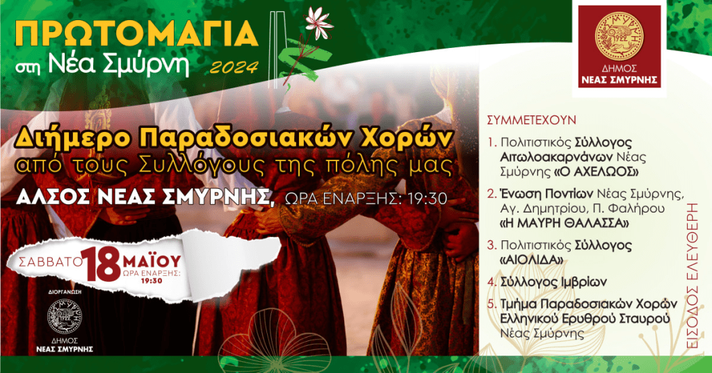 Ολοκληρώνονται το Σαββατοκύριακο 18-19 Μαΐου οι Πρωτομαγιάτικες εκδηλώσεις που διοργάνωσε ο Δήμος Νέας Σμύρνης, με ένα διήμερο παραδοσιακών χορών από τους πολιτιστικούς συλλόγους της πόλης.