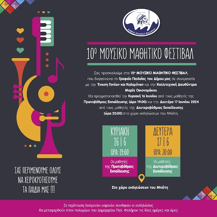 O Δήμος Π. Φαλήρου πραγματοποιεί για δέκατη χρονιά το Μουσικό Μαθητικό Φεστιβάλ με μοναδικό του σκοπό να δώσει την ευκαιρία σε μαθητές να εκφραστούν μέσω του τραγουδιού ατομικά ή ομαδικά.