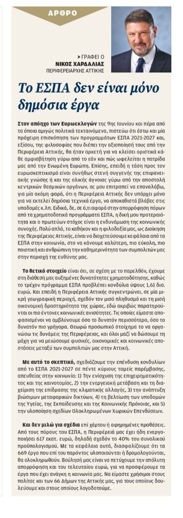 Άρθρο του Περιφερειάρχη Αττικής στη «Βραδυνή της Κυριακής»