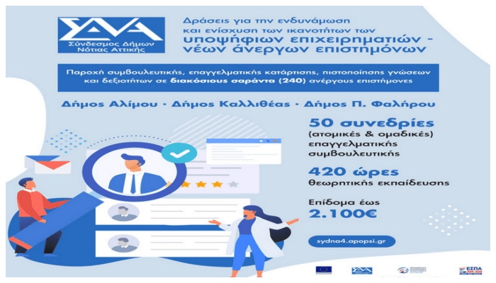 Το έργο «Δράσεις για την ενδυνάμωση και ενίσχυση των ικανοτήτων των υποψήφιων επιχειρηματιών / νέων άνεργων επιστημόνων» με MIS 5073527 που υλοποιείται από τον Σύνδεσμο Δήμων Νότιας Αττικής (Συ.Δ.Ν.Α.) σε συνεργασία με τους Δήμους Αλίμου, Καλλιθέας, και Παλαιού Φαλήρου έχει στόχο την υποστήριξη διακοσίων σαράντα (240) νέων άνεργων επιστημόνων που επιθυμούν να λάβουν εξειδικευμένες γνώσεις σχετικά με τις δυνατότητες ανάπτυξης επιχειρηματικών πρωτοβουλιών, και να εφοδιαστούν με κατάλληλα εργαλεία, γνώσεις και δεξιότητες που δύναται να τους διασφαλίσουν στο μεγαλύτερο δυνατό βαθμό μια πετυχημένη επιχειρηματική πορεία.