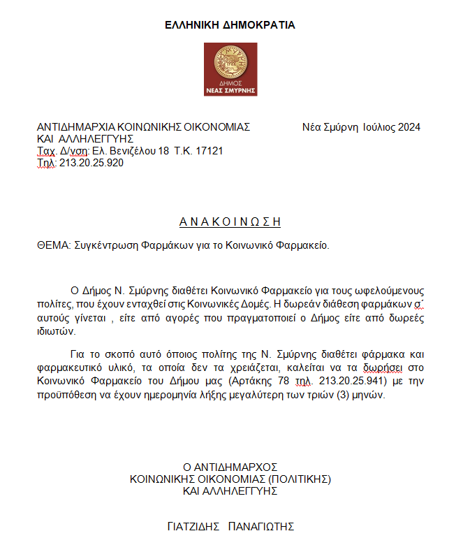 Ο Δήμος Ν. Σμύρνης με ανακοίνωση του καλεί όποιους πολίτες διαθέτουν φάρμακα και φαρμακευτικό υλικό, τα οποία δεν χρειάζονται, να τα δωρήσουν στο Κοινωνικό Φαρμακείο του Δήμου.
