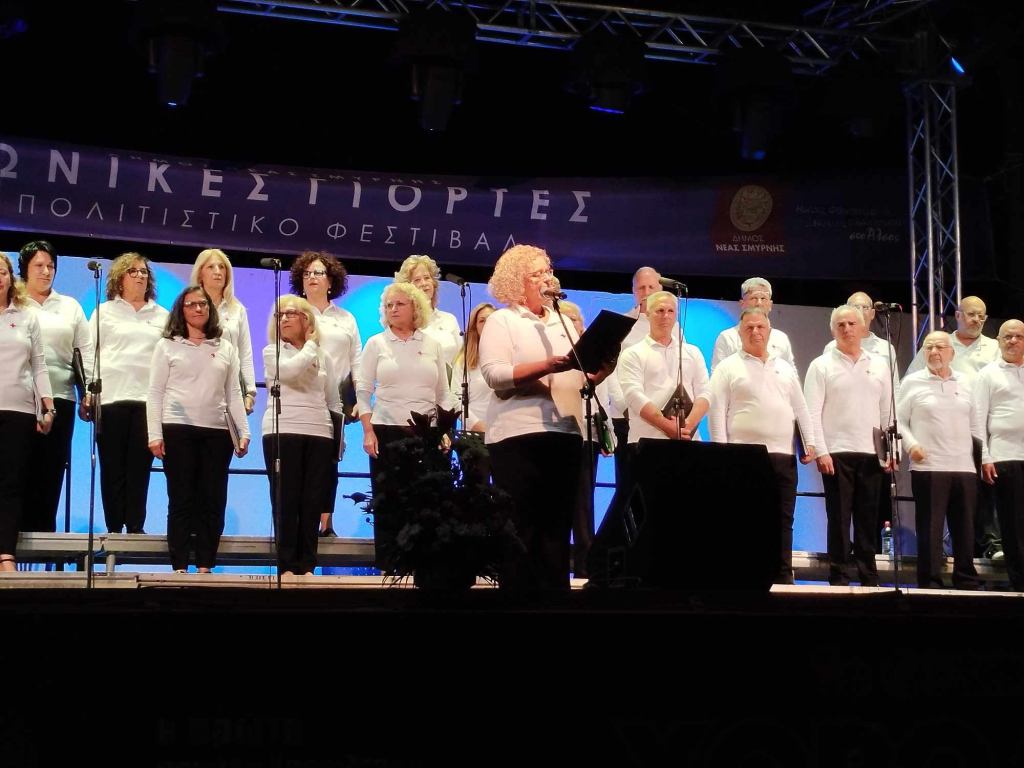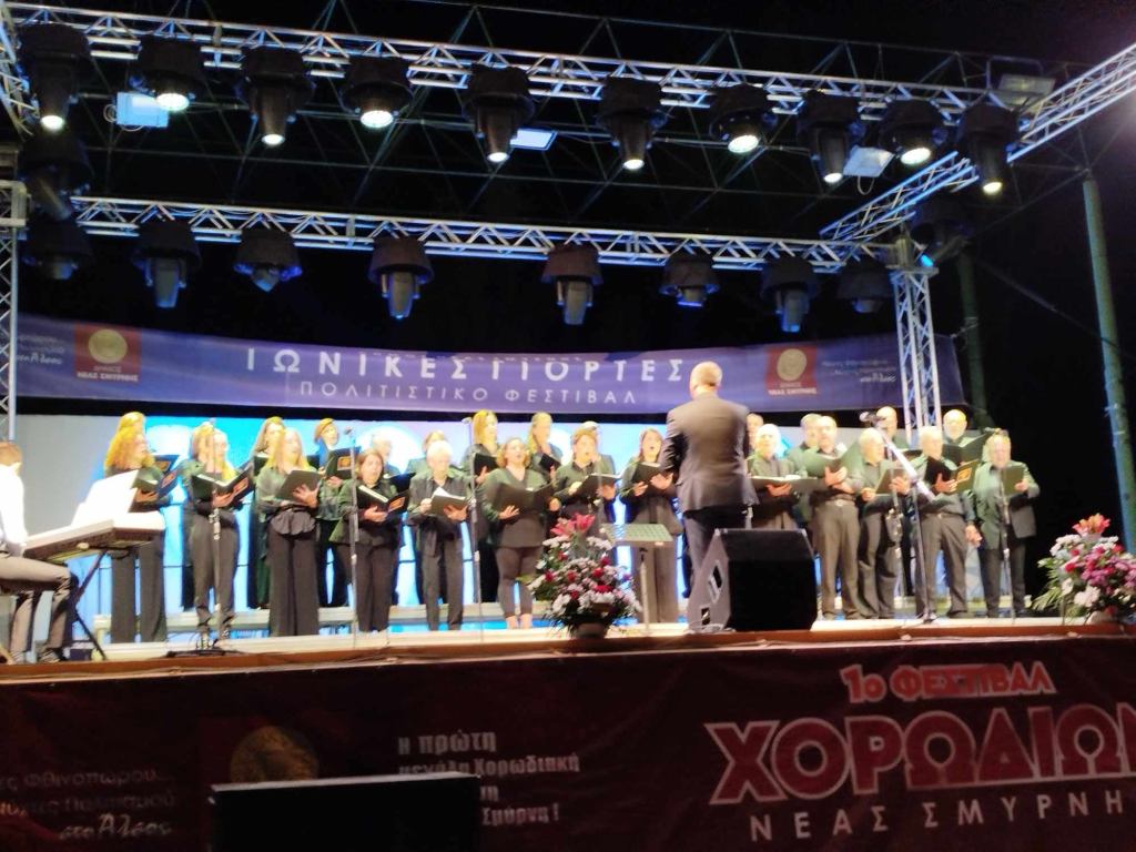 Τη Δευτέρα 30 Σεπτεμβρίου πραγματοποιήθηκε η πρώτη μεγάλη χορωδιακή συνάντηση στο Άλσος της Νέας Σμύρνης, με την οποία έκλεισαν οι φετινές Ιωνικές Γιορτές. Ήταν μία βραδιά πολιτισμού, γεμάτη με μελωδίες, που μάγεψαν το κοινό, μια βραδιά που σίγουρα έβαλε παρακαταθήκη και για άλλες παρόμοιες στο μέλλον.