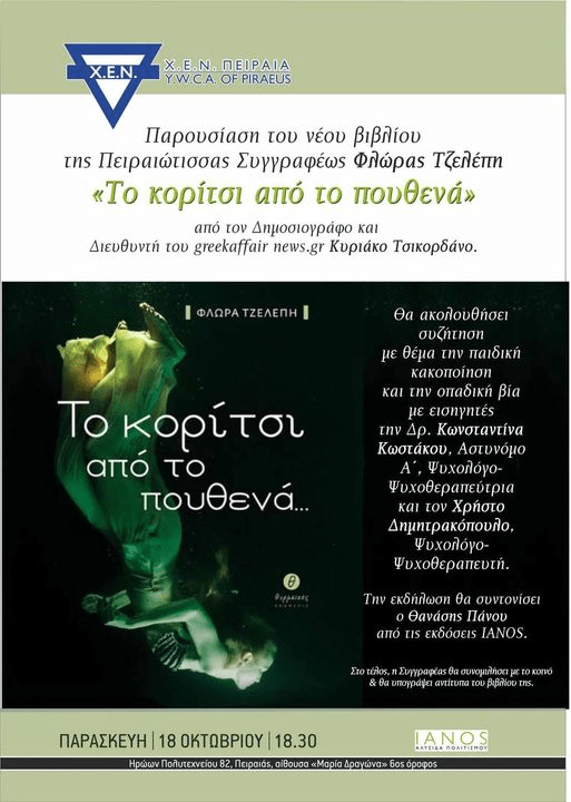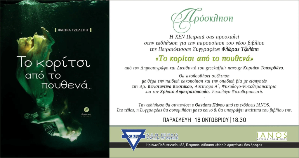 Την Παρασκευή 18 Οκτωβρίου, στην αίθουσα «Μαρία Δραγώνα» της ΧΕΝ Πειραιά, θα πραγματοποιηθεί η παρουσίαση του νέου μυθιστορήματος της καταξιωμένης συγγραφέως Φλώρας Τζελέπη «Το κορίτσι από το πουθενά…». Είναι ένα μυθιστόρημα την υπόθεση της οποίας εμπνεύστηκε στο τελευταίο ταξίδι της στην Πάτμο και κυκλοφορεί από τις εκδόσεις «ΙΑΝΟΣ».