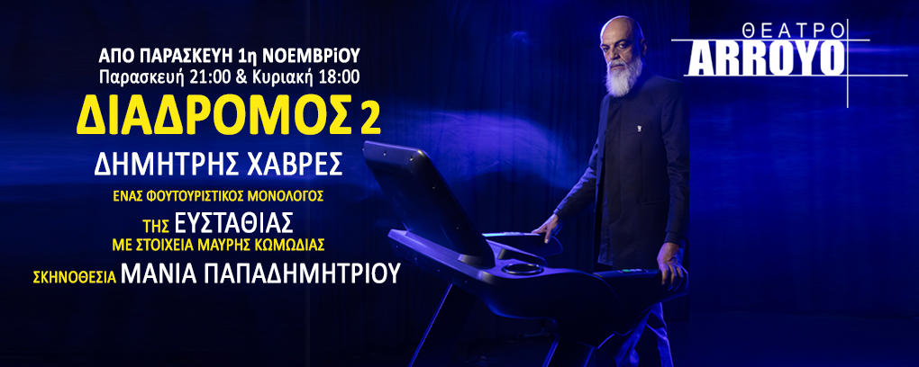 Στην Κεντρική Σκηνή του Θεάτρου ARROYO, παρουσιάζεται ο ΔΙΑΔΡΟΜΟΣ 2 της Ευσταθίας, έντεκα χρόνια μετά την πρώτη του παρουσίαση. Πρόκειται για ένα φουτουριστικό μονόλογο με στοιχεία μαύρης κωμωδίας που ερμηνεύει ο γνωστός Νεοσμυρνιός ηθοποιός Δημήτρης Χαβρές σε σκηνοθεσία της Μάνιας Παπαδημητρίου.