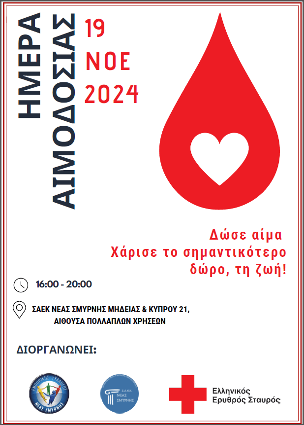 Την Τρίτη 19 Νοεμβρίου και ώρα 16:00 έως 20:00, θα πραγματοποιηθεί εθελοντική αιμοδοσία, στην Αίθουσα Πολλαπλών Χρήσεων ΣΑΕΚ Ν. Σμύρνης (Μηδείας και Κύπρου 21)