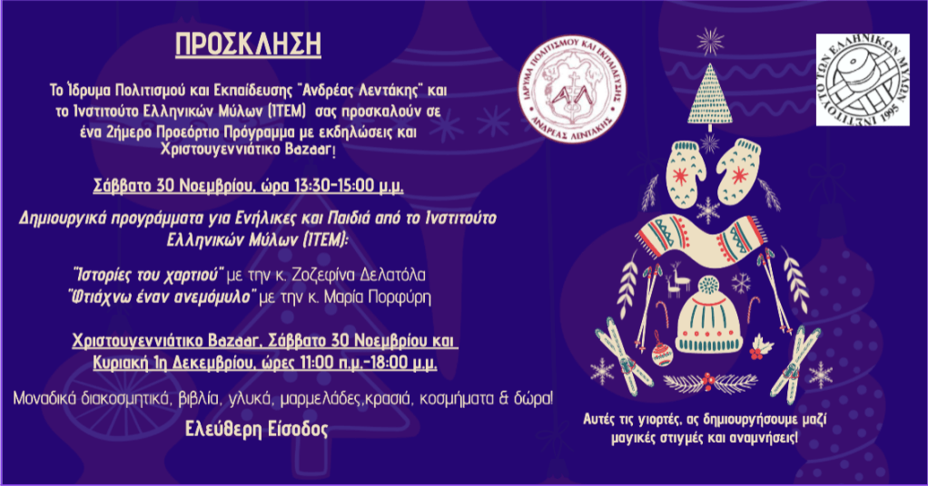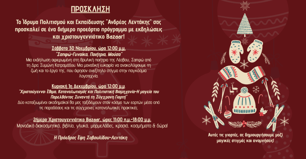 Αυτές τις γιορτές, ας δημιουργήσουμε μαζί μαγικές στιγμές και αναμνήσεις! Στο Χριστουγεννιάτικο Bazaar μας θα βρείτε μοναδικά διακοσμητικά, είδη για το σπίτι, την κουζίνα, που θα δώσουν μια ζεστή εορταστική ατμόσφαιρα στο τραπέζι και το σπίτι σας. Ανακαλύψτε υπέροχα δώρα για την οικογένειά σας, τους φίλους σας και τα εγγόνια σας, ιδανικά για να εκφράσετε την αγάπη σας αυτές τις γιορτινές μέρες. Στη διάθεση σας βιβλία παντός ενδιαφέροντος και βιβλία Ανδρέα Λεντάκη. Και για να γλυκαθούν οι καρδιές όλων, εκτός από τα κεράσματα μας, θα βρείτε επίσης λαχταριστά γλυκά, σπιτικές μαρμελάδες, γνήσιο μέλι, εκλεκτά κρασιά και υπέροχα κοσμήματα που θα ενθουσιάσουν εσάς και τους αγαπημένους σας.