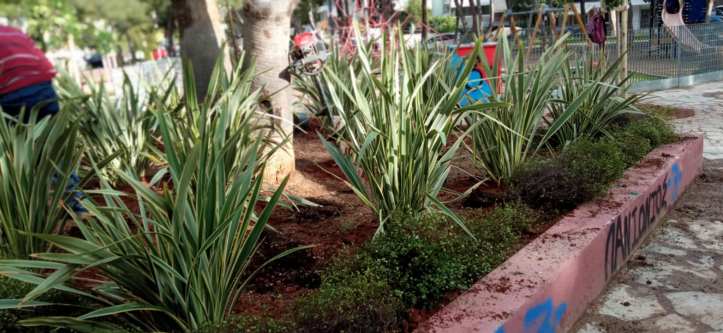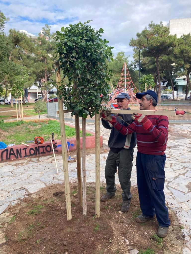 Επιπλέον φυτεύτηκε το μεγάλο κεντρικό παρτέρι με θάμνους και φυτά εδαφοκάλυψης, ενώ η ανάπλαση θα ολοκληρωθεί τις επόμενες ημέρες με εκτεταμένη φύτευση 30 και πλέον πεύκων και κυπαρισσιών στον πευκώνα.