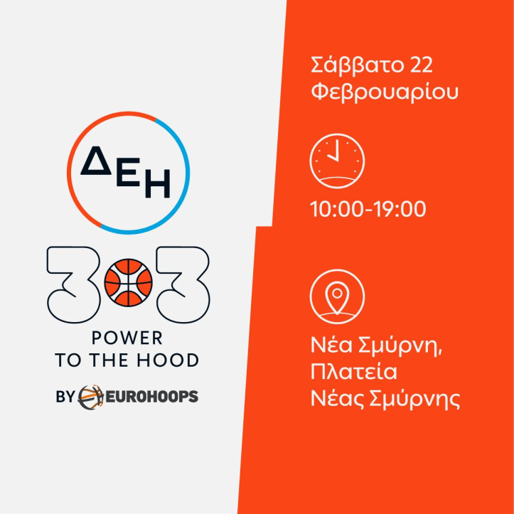 Η «μπασκετομάνα» Νέα Σμύρνη υποδέχεται την μεγάλη γιορτή του μπάσκετ το Σάββατο 22 Φεβρουαρίου στην Κεντρική Πλατεία. Πρόκειται για το ΔΕΗ 3×3 POWER TO THE HOOD by Eurohoops μια μεγάλη μπασκετική γιορτή για όλους και όλες, μικρούς και μεγάλους που υπόσχεται, όχι μόνο με τουρνουά 3×3 αλλά και πολλές παράλληλες ψυχαγωγικές δραστηριότητες.