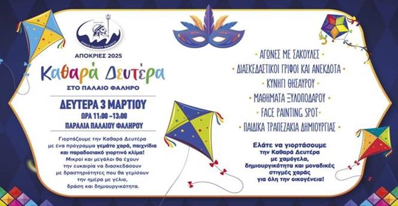 Ο Δήμαρχος Παλαιού Φαλήρου Γιάννης Φωστηρόπουλος, σας προσκαλεί για να γιορτάσουμε την Καθαρά Δευτέρα με ένα πρόγραμμα γεμάτο χαρά, παιχνίδια και παραδοσιακό γιορτινό κλίμα! Μικροί και μεγάλοι θα έχουν την ευκαιρία να διασκεδάσουν με δραστηριότητες που θα γεμίσουν την ημέρα με γέλιο, δράση και δημιουργικότητα.
