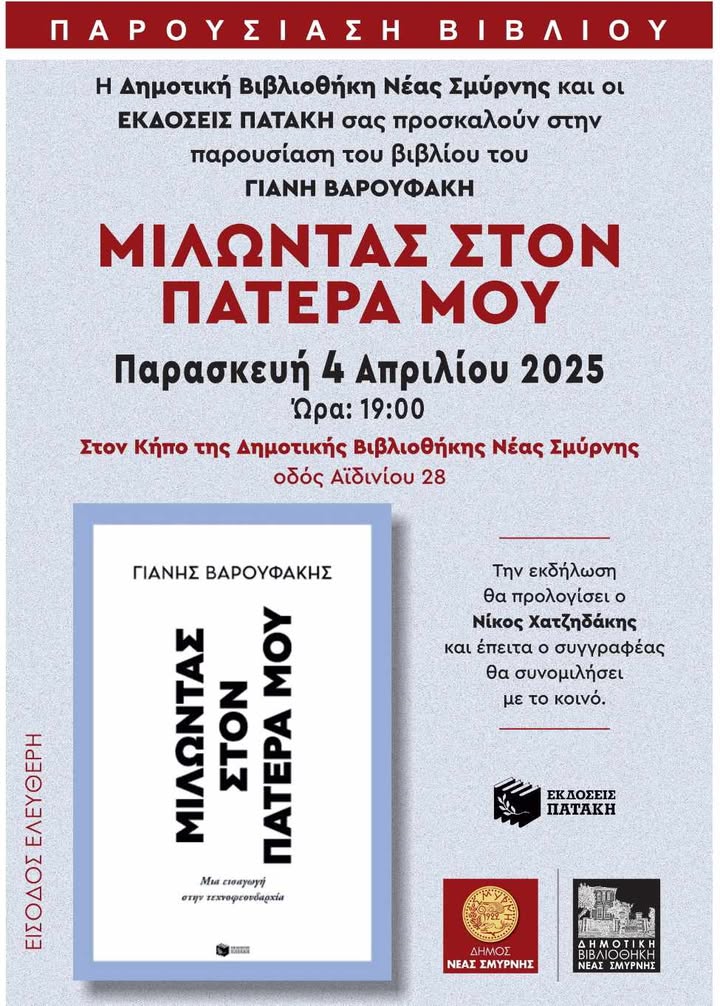 H Δημοτική Βιβλιοθήκη Νέας Σμύρνης και οι Εκδόσεις Πατάκη σας προσκαλούν την Παρασκευή 4 Απριλίου και ώρα 7:00 μ.μ. στον κήπο της Δημοτικής Βιβλιοθήκης (Αϊδινίου 28, στάση Τραμ: Μεγάλου Αλεξάνδρου), στην παρουσίαση του νέου βιβλίου του Γιάνη Βαρουφάκη.