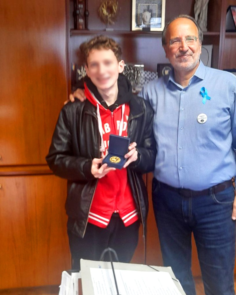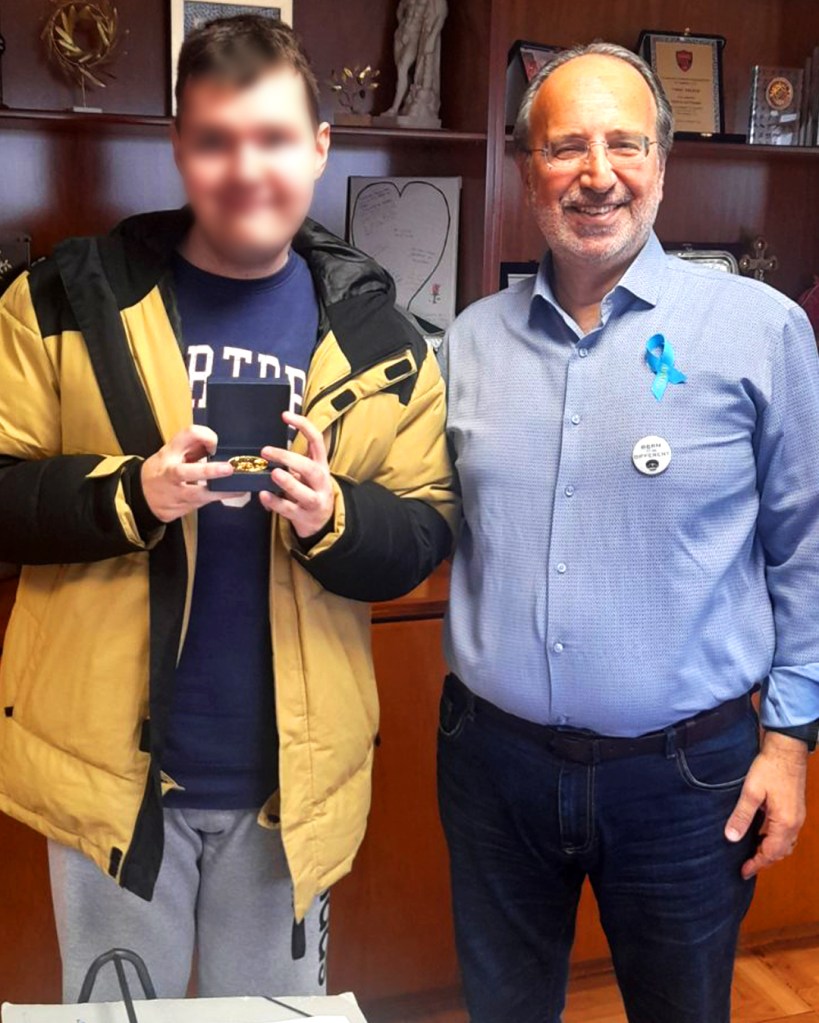 Στο γραφείο του Δημάρχου τοποθέτησαν συμβολικά το γαλάζιο κορδελάκι, σύμβολο ευαισθητοποίησης για τον αυτισμό στο πέτο των παρευρισκόμενων ενώ ο Γιώργος Κουτελάκης από την πλευρά του χάρισε στον Γιάννη και τον Χρήστο το το μετάλλιο της πόλης.