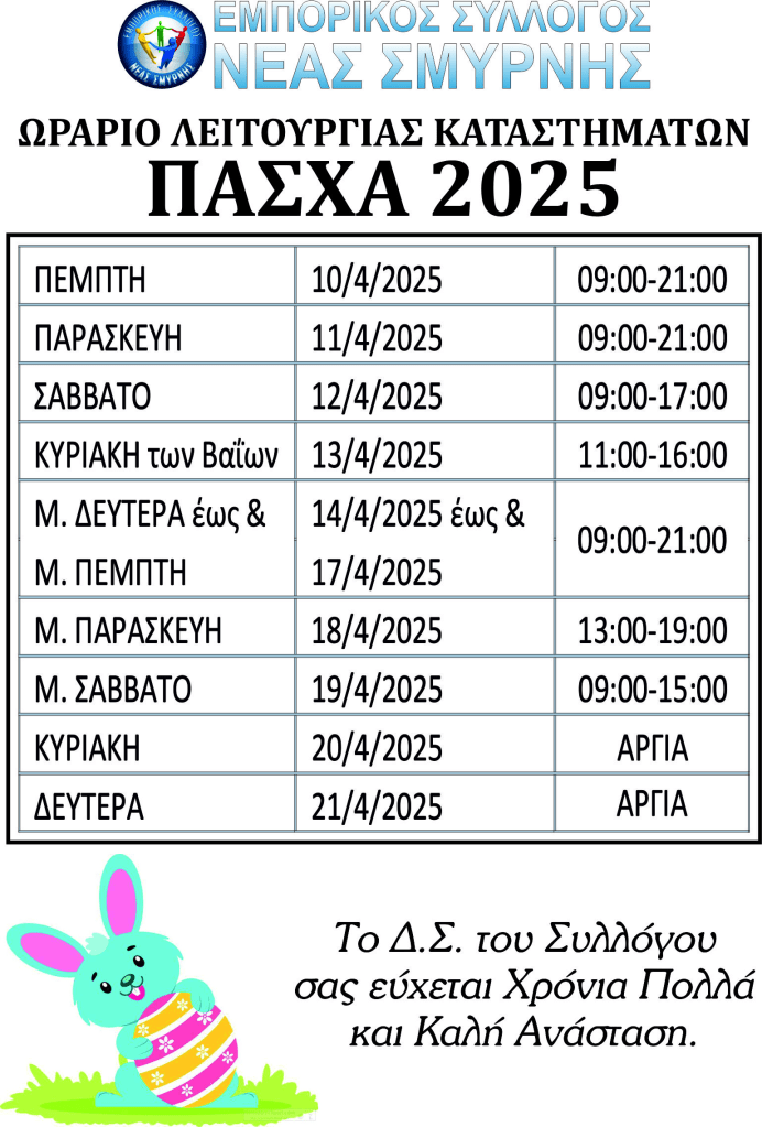 Ο Εμπορικός Σύλλογος Νέας Σμύρνης ανακοίνωσε σήμερα το εορταστικό ωράριο των καταστημάτων, ενόψει της Μεγάλης Εβδομάδας και του Πάσχα.
