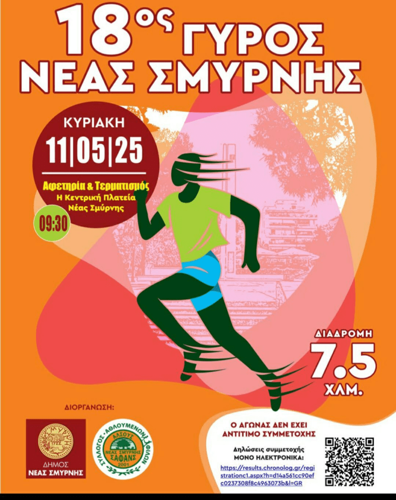 Την Κυριακή 11 Μαΐου πραγματοποιείται ο 18ος Γύρος Νέας Σμύρνης, που συνδιοργανώνουν ο Δήμος Νέας Σμύρνης και ο Σύλλογος Αθλουμένων Φίλων Άλσους (ΣΑΦΑΝΣ). Η διαδρομή των 7,5 χιλιομέτρων θα έχει αφετηρία και τερματισμό την Κεντρική Πλατεία της Νέας Σμύρνης.