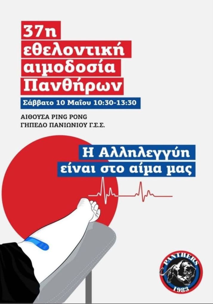 Με κεντρικό σύνθημα «Η αλληλεγγύη ειναι στο αιμα μας», πραγματοποιείται το Σάββατο 10 Μαΐου η 37η Αιμοδοσία του Panthers Club. Η αιμοδοσια θα γινει από 10.30 το πρωι εως 13.30 το μεσημερι, στην αίθουσα του Πινγκ Πονγκ του Πανιωνίου Γ.Σ.Σμύρνης (Ι.Χρυσοστόμου 1 και Σοφούλη γωνία).