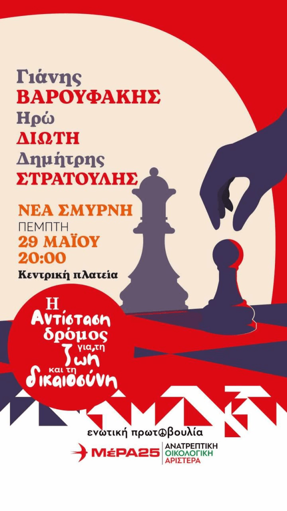 Η ενωτική πρωτοβουλία ΜέΡΑ25 | Ανατρεπτική Οικολογική Αριστερά διοργανώνει κεντρική πολιτική εκδήλωση, την Πέμπτη, 29 Μαΐου, στις 20:00, στην Κεντρική Πλατεία στη Νέα Σμύρνη.