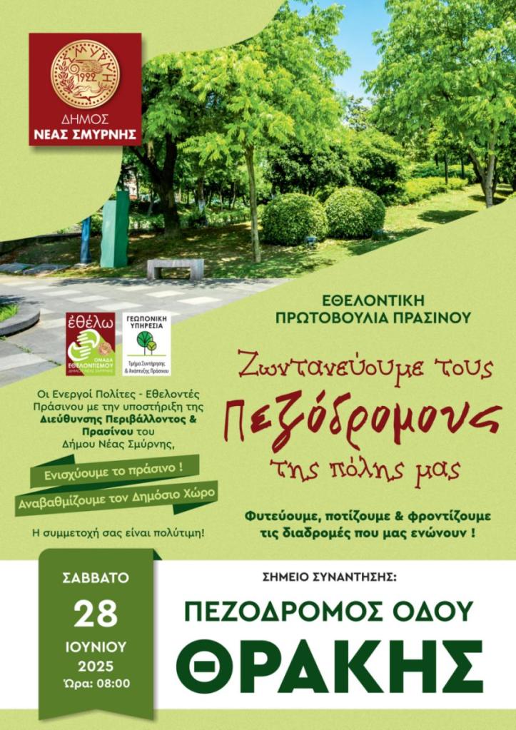 Από τον πεζόδρομο της οδού Θράκης (Πλατεία Βασ. Σοφίας) ξεκίνησε από τους Εθελοντές Πρασίνου του Δήμου, η δράση «Ζωντανεύουμε τους πεζόδρομους της Νέας Σμύρνης», η οποία έχει ως στόχο την ενίσχυση του πρασίνου και την αναβάθμιση του δημόσιου χώρου.