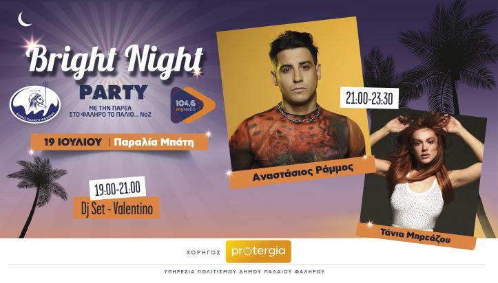 Στην παραλία του Μπάτη, δίπλα στο κύμα θα πραγματοποιηθεί το 2ο BE ACH PARTY του Δήμου Παλαιού Φαλήρου. Οι διοργανωτές σας περιμένουν, το Σάββατο 19/7 στις 21:00 το βράδυ, με την παρέα σας στο Φάληρο το Παλιό για δεύτερη φορά, στο Bright Night Party. Ο Αναστάσιος Ράμμος και η Τάνια Μπρεάζου θα ανέβουν στο stage και θα ερμηνεύσουν γνωστές επιτυχίες, ενώ το πρόγραμμα θα ανοίξει ο σπουδαίος ραδιοφωνικός παραγωγός και DJ Valentino.