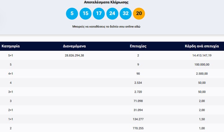 Οι τυχεροί αριθμοί στην κλήρωση Τζόκερ σήμερα είναι: 5, 15, 17, 24, 32 και Τζόκερ το 20.