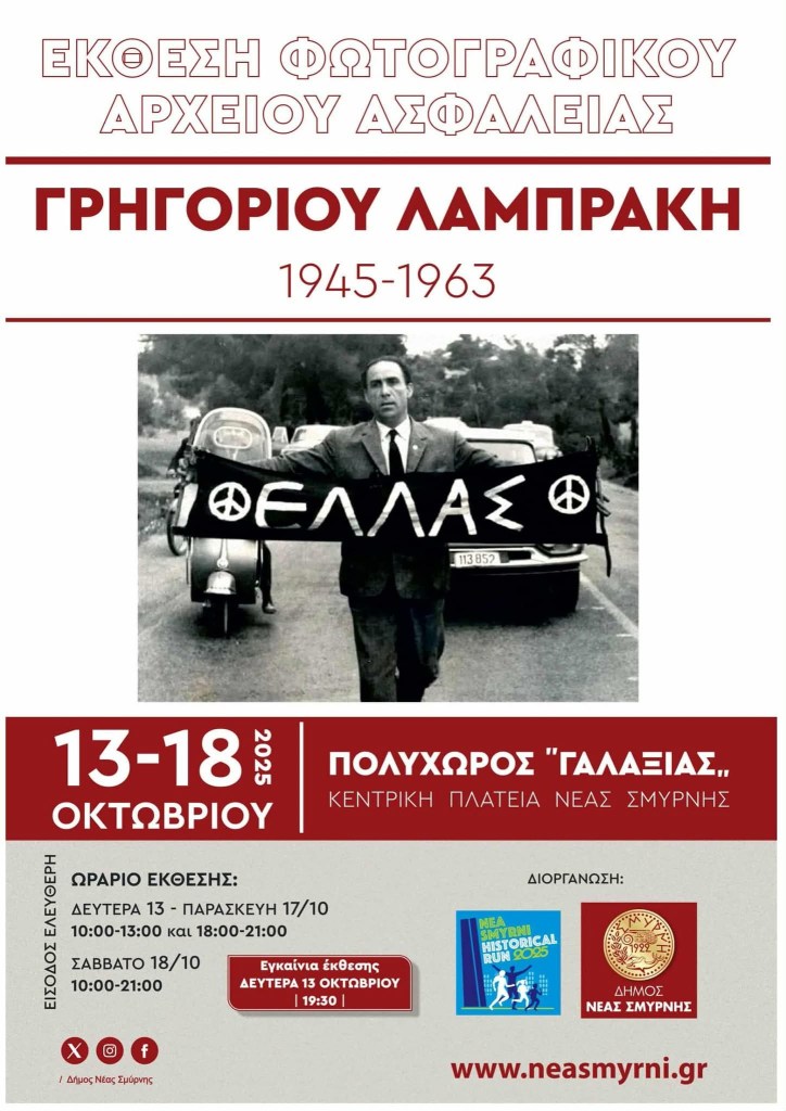 Ιστορία λοιπόν της Νέας Σμύρνης, ΜΙΚΗΣ ΘΕΟΔΩΡΑΚΗΣ, αλλά και ΓΡΗΓΟΡΗΣ ΛΑΜΠΡΑΚΗΣ ο γιατρός, ο αθλητής, ο Ειρηνιστής. Ο Λαμπράκης που δολοφονήθηκε το 1963, ενώ συμμετείχε σε αντιπολεμική πορεία. Μετά την δολοφονία του, ο Μίκης Θεοδωράκης ίδρυσε την » ΝΕΟΛΑΙΑ ΛΑΜΠΡΑΚΗ» και έγινε ο πρώτος της Πρόεδρος. Η Έκθεση Αρχείων και Φωτογραφιών από την ζωή του ΓΡΗΓΟΡΗ ΛΑΜΠΡΑΚΗ που θα οργανωθεί στον ΓΑΛΑΞΙΑ συμπληρώνει το παζλ, δίνει ένα συνολικό συμβολισμό με σύγχρονες προεκτάσεις στον φετινό Αγώνα Μνήμης.
