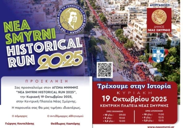 Την Κυριακή 19 Οκτωβρίου τρέχουμε στους δρόμους της σύγχρονης πόλης μας, συνεχίζουμε την παράδοση και το αποτύπωμα που έχει αφήσει στην πόλη μας ο Αγώνας Μνήμης και Ιστορίας, «Nea Smyrni Historical Run».