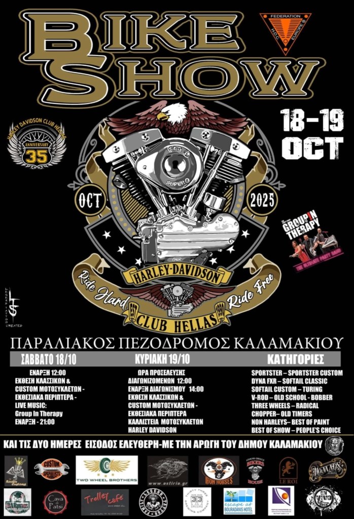 Η εκδήλωση που όλοι οι φίλοι της Harley Davidson περιμένουν, θα διεξαχθεί και φέτος στον Άλιμο. Το Bike Show 2025 διοργανώνεται από το Harley Davidson Club Hellas και αναμένεται να προσελκύσει χιλιάδες κόσμου. Η διήμερη εκδήλωση θα γίνει το Σάββατο 18 και την Κυριακή 19 Οκτωβρίου, στον παραλιακό πεζόδρομο Αλίμου, στον χώρο που φιλοξενεί κάθε καλοκαίρι το Cine Alimos.