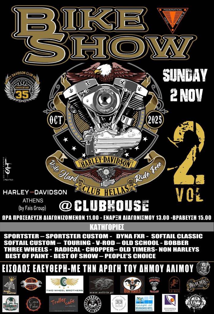 Όπως ανακοινώθηκε, την Κυριακή 2 Νοεμβρίου το Bike Show 2025 θα ολοκληρωθεί, αυτή τη φορά όχι στο Άλιμο, αλλά στο Περιστέρι όπου βρίσκεται η έδρα του Harley Davidson Club Hellas, στην οδό Αγίας Παρασκευής 50. Οι διαγωνιζόμενοι θα προσέλθουν στις 11:00 το πρωί, ο διαγωνισμός θα ξεκινήσει στις 13:00 και οι βραβεύσεις θα γίνουν στις 15:00 το μεσημέρι. Θα ακολουθήσει πάρτι με μουσική, BBQ κλπ. Η εκδήλωση είναι ανοιχτή για το κοινό, με ελεύθερη είσοδο.