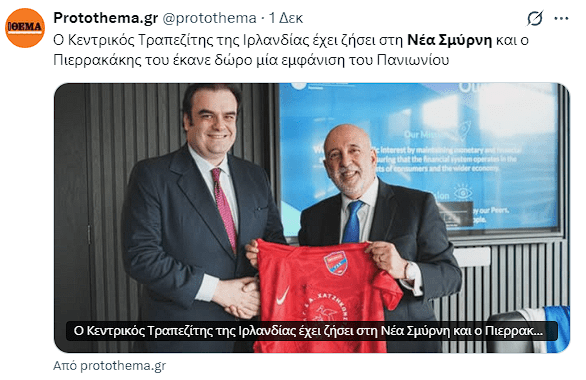 Το κορυφαίο θέμα φυσικά έχει να κάνει με τον Πανιώνιο, τη φανέλα του οποίου χάρισε ο κ. Πιερρακάκης στον Κεντρικό Τραπεζίτη της Ιρλανδίας, που είναι φανατικός φίλος των κυανέρυθρων.