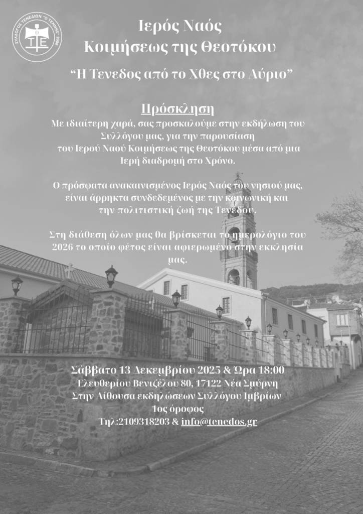 O Συλλόγος Τενεδίων «Ο ΤΕΝΝΗΣ» διοργανώνει εκδήλωση με θέμα «Ιερός Ναός Κοιμήσεως της Θεοτόκου – Η Τένεδος, από το χθές στο αύριο»