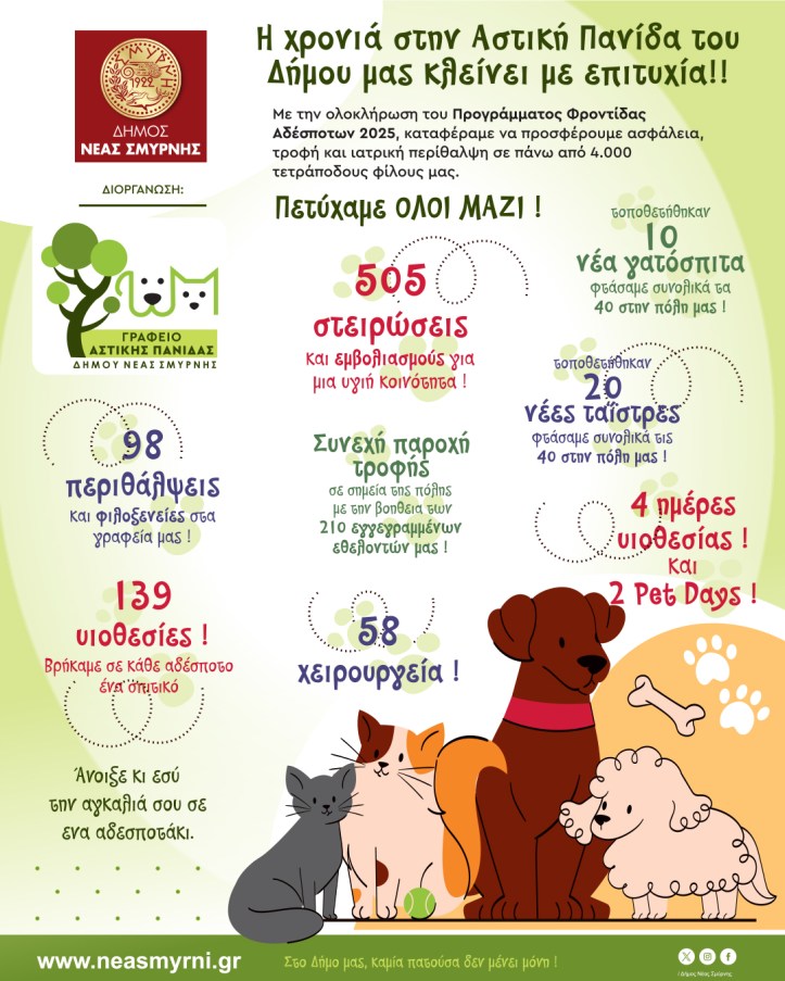 Το Γραφείο Αστικής Πανίδας του Δήμου Νέας Σμύρνης δηλώνει ότι θα συνεχιστούν με τον ίδιο ενθουσιασμό οι προσπάθειες για «να μην μείνει καμία πατούσα μόνη…»