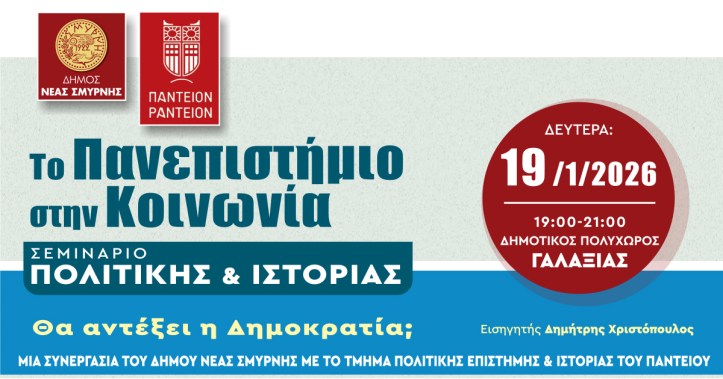 Ξεκινά την Δευτέρα 19 Ιανουαρίου 2026 ο Κύκλος Σεμιναρίων Πολιτικής και Ιστορίας με τον γενικό τίτλο “Το Πανεπιστήμιο στην Κοινωνία”, που θα πραγματοποιηθεί στο πλαίσιο Μνημονίου Συνεργασίας ανάμεσα στον Δήμο Νέας Σμύρνης και το Πάντειο Πανεπιστήμιο.