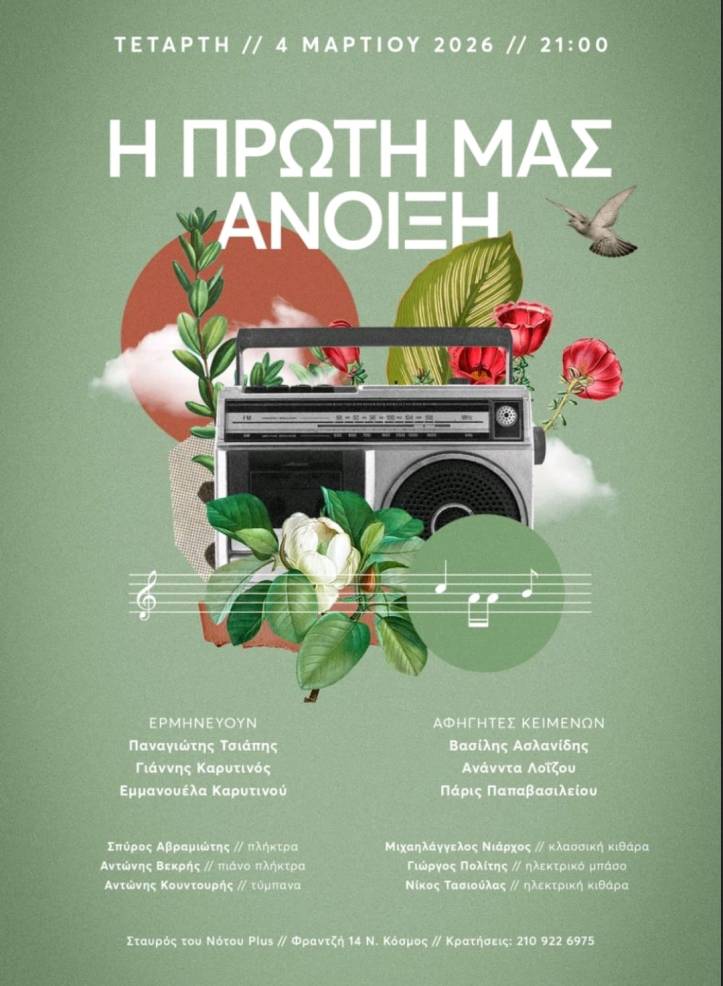 Μία ξεχωριστή βραδιά με μουσική και αφήγηση, ανεβαίνει στη σκηνή του Σταυρού του Νότου την Τετάρτη 4 Μαρτίου στις 21:00 το βράδυ. Μια παράσταση που υπόσχεται ένα ταξίδι στον χρόνο και στις αναμνήσεις. Η βραδιά, με τίτλο «Η πρώτη μας άνοιξη», συνδυάζει τραγούδια που σημάδεψαν γενιές με αφηγήσεις που ανακαλούν εικόνες και συναισθήματα.