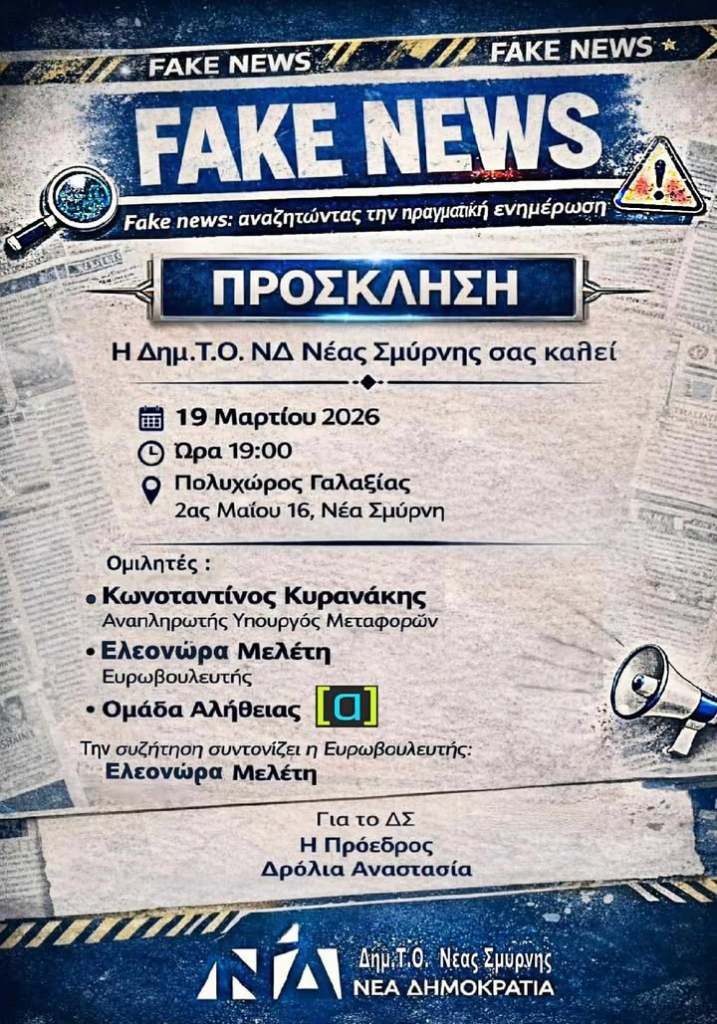 Η Δημοτική Τοπική Οργάνωση ΝΔ Νέας Σμύρνης διοργανώνει εκδήλωση – ομιλία με θέμα «Fake News: Αναζητώντας την πραγματική ενημέρωση». Η εκδήλωση θα γίνει την Πέμπτη 19 Μαρτίου στον Πολυχώρο «Γαλαξίας» στην Κεντρική Πλατεία Νέας Σμύρνης.