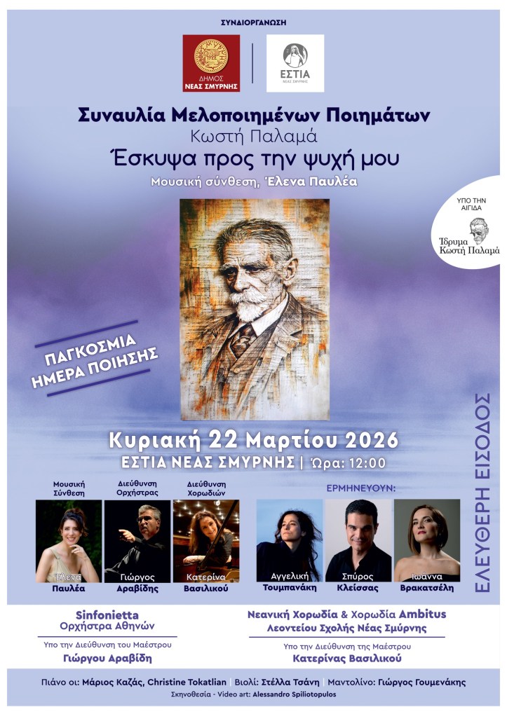 «Έσκυψα προς την ψυχή μου» είναι ο τίτλος της συναυλίας αφιερωμένης στον ποιητικό λόγο του Κωστή Παλαμά που θα πραγματοποιηθεί την Κυριακή 22 Μαρτίου, ώρα 12:00 στην Εστία Νέας Σμύρνης. Πρόκειται για μια πρωτοβουλία του Δήμου Νέας Σμύρνης, που διοργανώνεται από κοινού με την Εστία Νέας Σμύρνης, με αφορμή την Παγκόσμια Ημέρα Ποίησης, υπό την αιγίδα του Ιδρύματος Παλαμά, με ΕΛΕΥΘΕΡΗ ΕΙΣΟΔΟ.