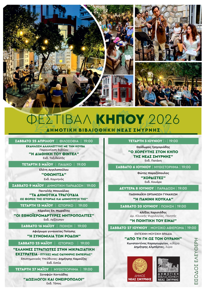 Για τρίτη συνεχόμενη χρονιά η Δημοτική Βιβλιοθήκη Νέας Σμύρνης (Αϊδινίου 28) ανοίγει τον φιλόξενο κήπο της για το «Φεστιβάλ Κήπου 2026» από τις 25 Απριλίου έως τις 27 Ιουνίου.