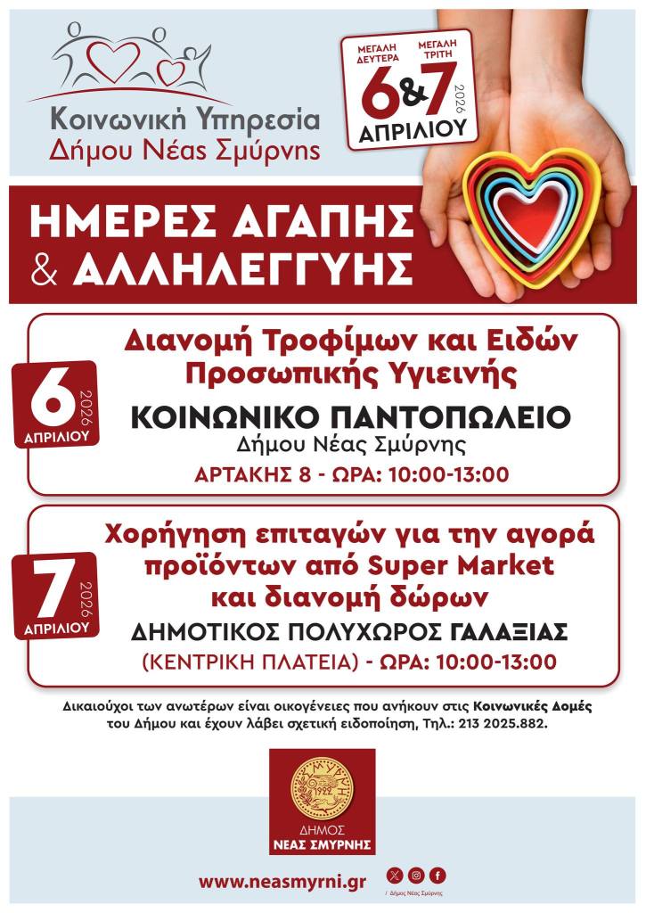 Εκτός από το Έκτακτο Οικονομικό Βοήθημα συνολικού ύψους 80.720 ευρώ που χορηγήθηκε σε 629 οικογένειες, την Μεγάλη Δευτέρα και την Μεγάλη Τρίτη η Κοινωνική Υπηρεσία του Δήμου πραγματοποίησε τη δράση «Ημέρες Αγάπης και Αλληλεγγύης».