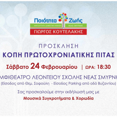 ΝΕΑ ΣΜΥΡΝΗ: Κόβει την πίτα της η δημοτική κίνηση «Ποιότητα Ζωής» το Σάββατο 24 Φεβρουαρίου