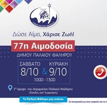 Σάββατο & Κυριακή 8 – 9/10: Η 77η Εθελοντική Αιμοδοσία Δήμου Παλαιού Φαλήρου