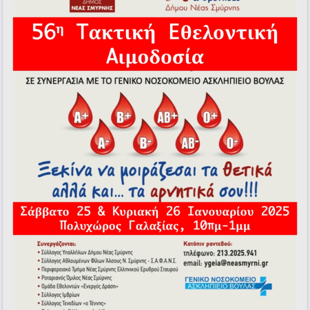 Εθελοντική αιμοδοσία 25-26 Ιανουαρίου στη Νέα Σμύρνη